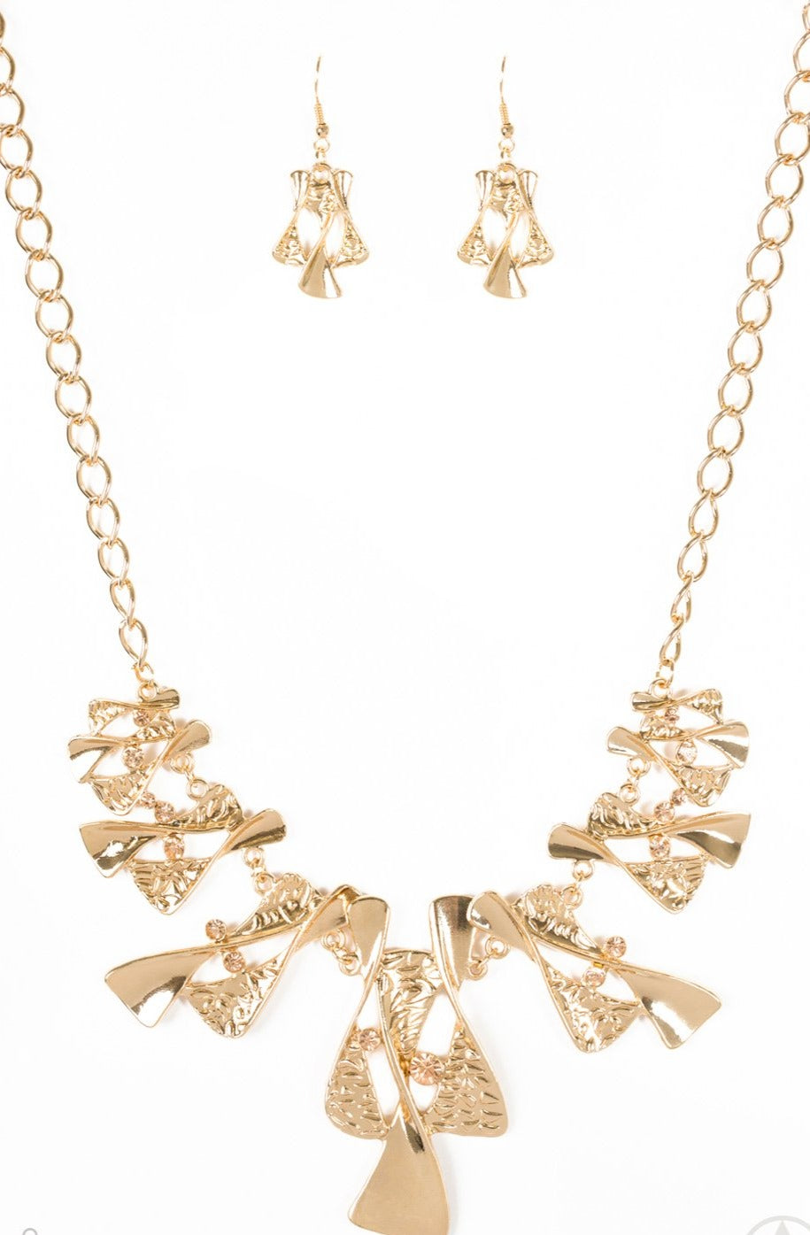 Twisted gold hourglasses dance along a chunky gold chain with tiny peach rhinestones adding sparkling, elegant accents. Beautiful textured pieces add depth to the design. Features an adjustable clasp closure.