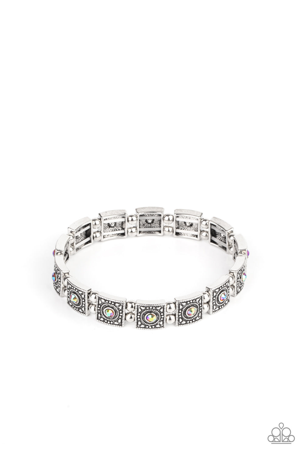 Dotted with orangey iridescent rhinestone centers, studded silver frames alternate with pairs of dainty silver beads along stretchy bands, creating a stellar centerpiece around the wrist.