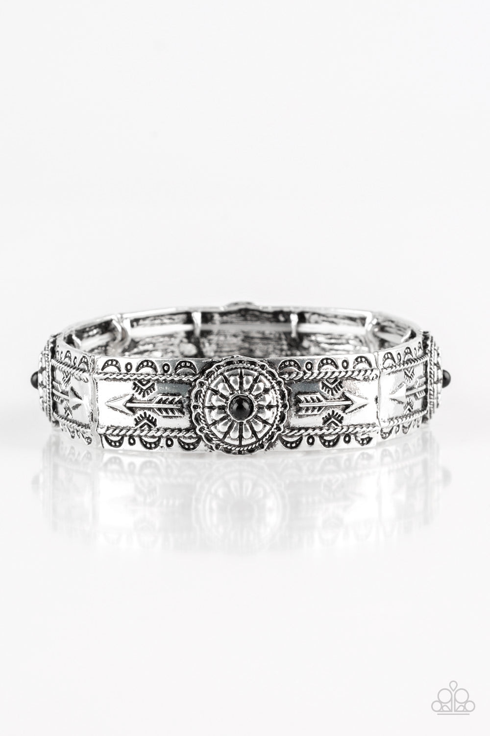 Embossed in decorative arrow detail, ornate silver frames are threaded along stretchy bands around the wrist. Dainty black beads adorn the centers of each frame for a seasonal finish.