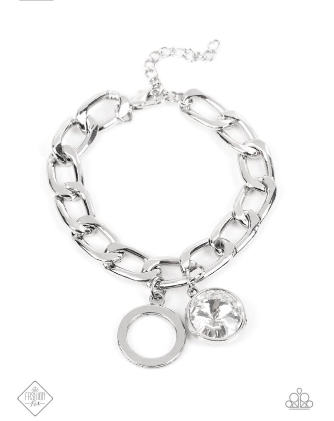 A thick strand of silver curb chain wraps around the wrist in a bold display. An oversized white gem encased in a gritty silver frame and a thick silver hoop swing from one of the exaggerated links, creating an unexpected hint of flirtatious movement. Features an adjustable clasp closure.