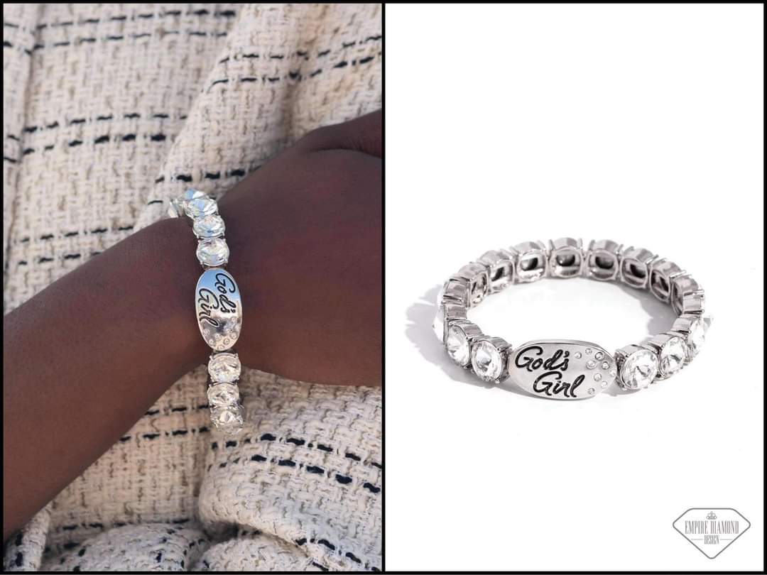 Infused along an elastic stretchy band around the wrist, pronged silver fittings featuring white gems glitter and glisten. An abstract silver oval pendant featuring dainty white rhinestones and the words, "God's Girl" creates an elegantly ethereal look.