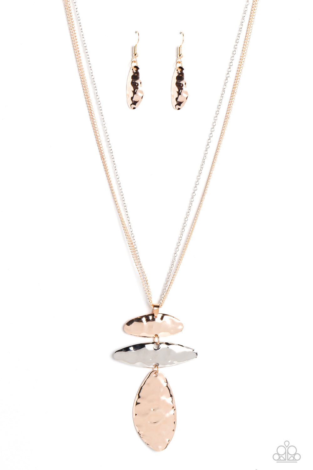 Featuring a hammered sheen, a trio of silver and rose gold, abstract shapes glides down the chest from a trio of dainty, silver and rose gold chains for a monochromatic mash-up. The two uppermost shapes are turned on their sides, one rose gold, the other silver, while the oversized, lowermost shape dangles below the layered design, reflecting light off its every ripple. Features an adjustable clasp closure.
