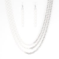 Rows of shimmery silver chain merge with shiny whitr chains, creating colorful layers below the collar. Features an adjustable clasp closure.Sold as one individual necklace. Includes one pair of matching earrings.