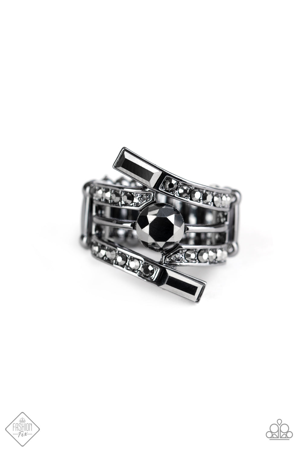 Curved gunmetal bars wrap around the finger, creating a stack of metallic sheen. A hematite rhinestone sits at the center of the design, while smaller pieces of hematite are sprinkled along the bars to emphasize the sparkle