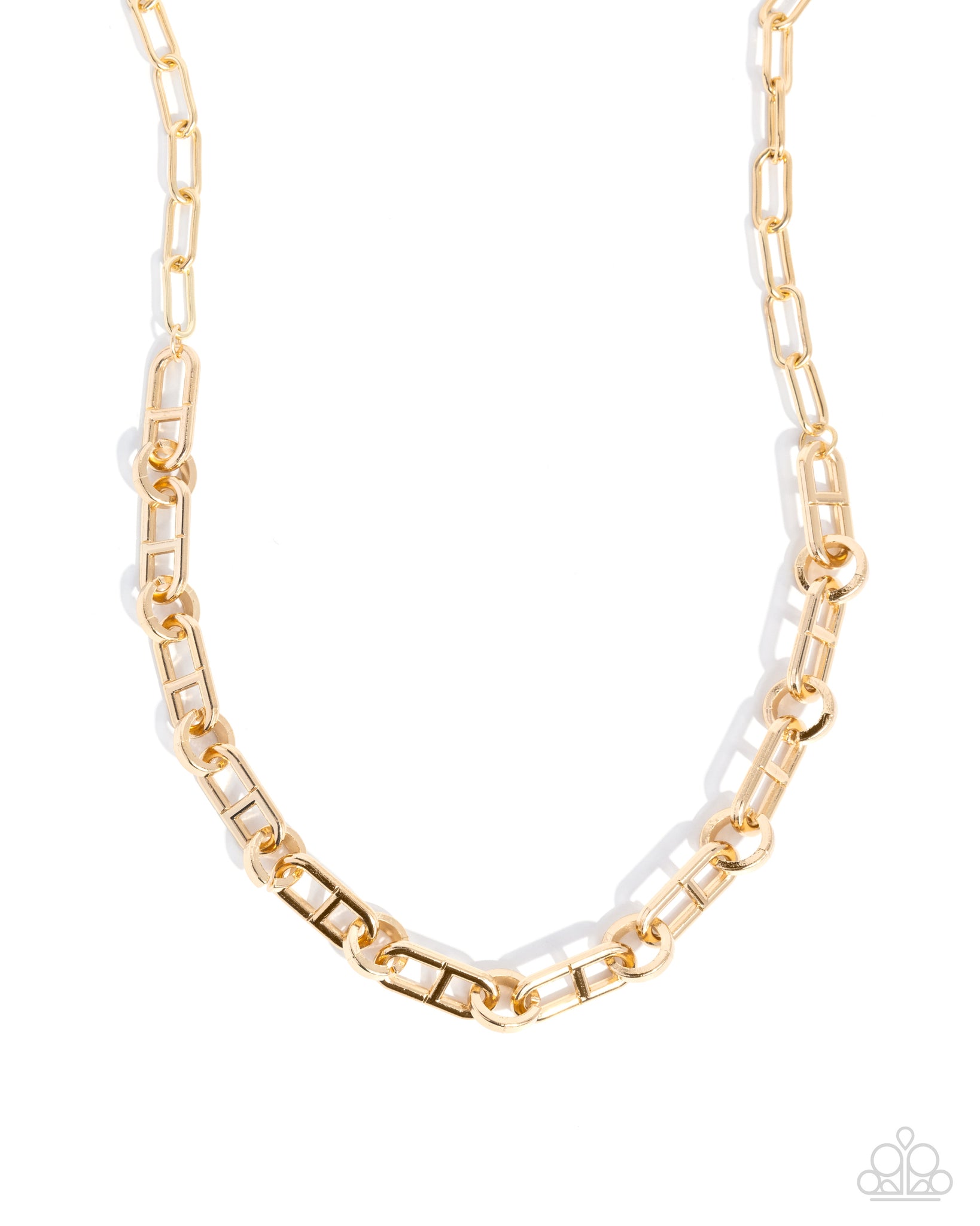 Alternating with gold wheel-like links, gold anchor links cascade along the neckline, connecting to gold paperclip chain links for a glistening, industrial display. Features an adjustable clasp closure.