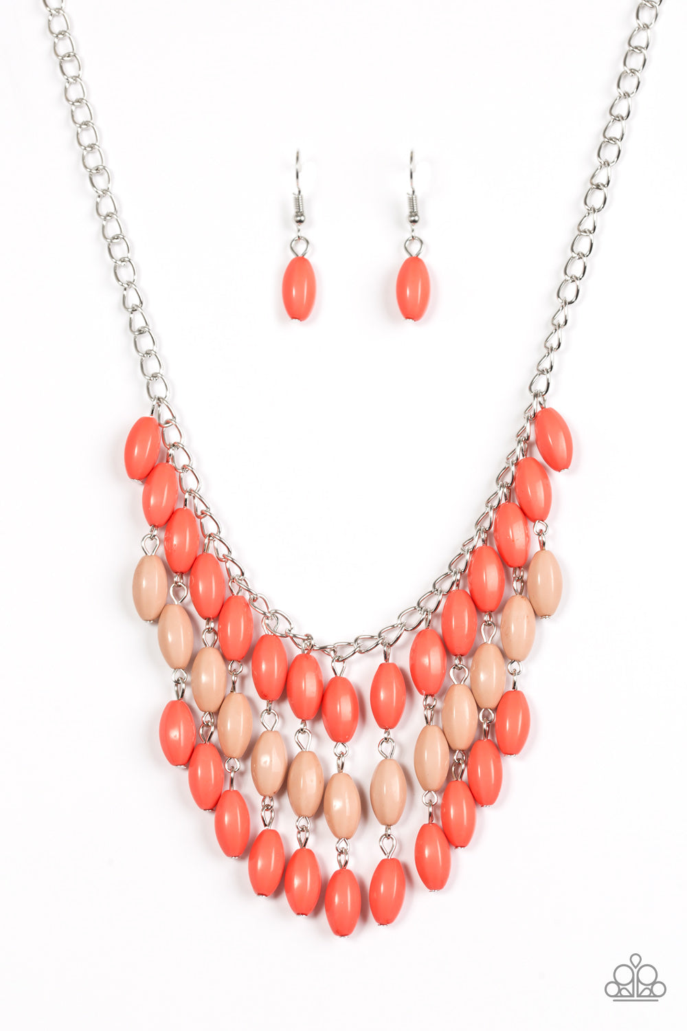 Faceted orange and tan beads cascade from the bottom of a shimmery silver chain, creating a flirty fringe below the collar. Features an adjustable clasp closure.